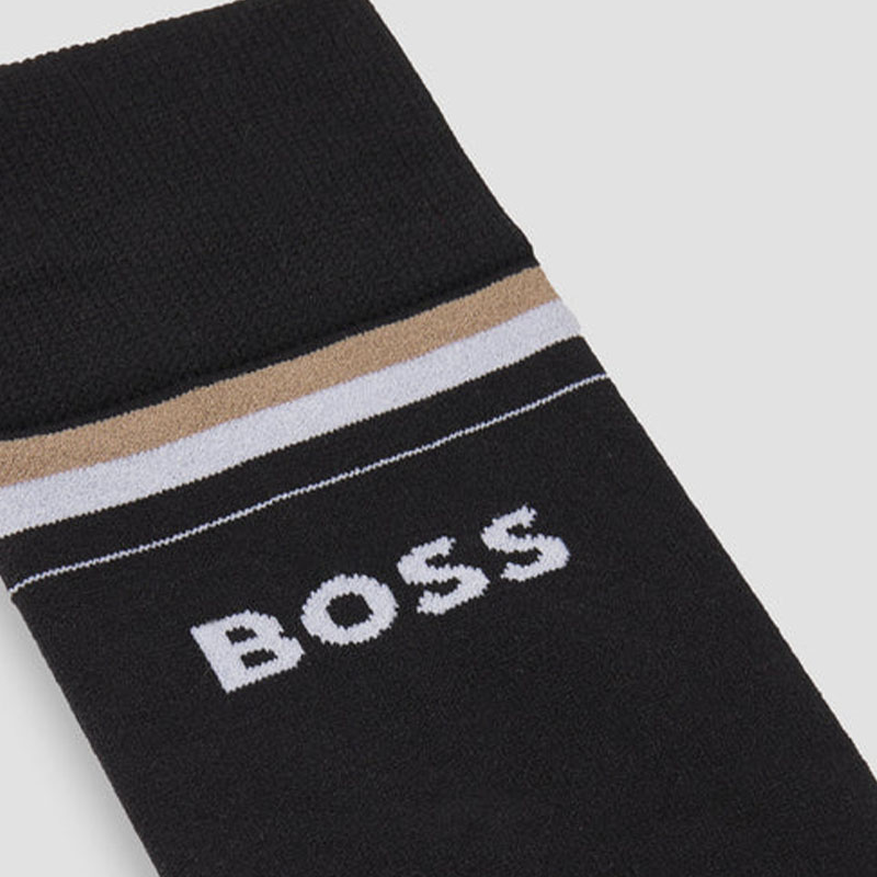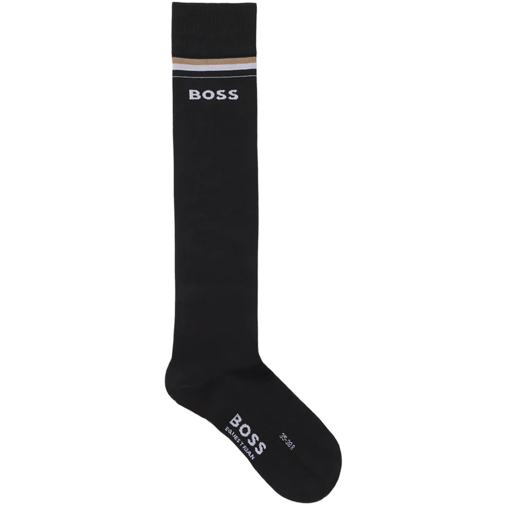 BOSS Equestrian Classic ridesokker er laget for komfort og funksjonalitet under ridning. Disse unisex svarte sokkene er formstrikket ved tær og hæl for optimal passform og har antiskli-beskyttelse i midtfoten for ekstra sikkerhet. Den myke sokken har en tett passform på benet, noe som gjør den tynn og komfortabel i støvlene. En innstrikket signaturstripe og BOSS-logo pryder sokken under den ribbede kanten.