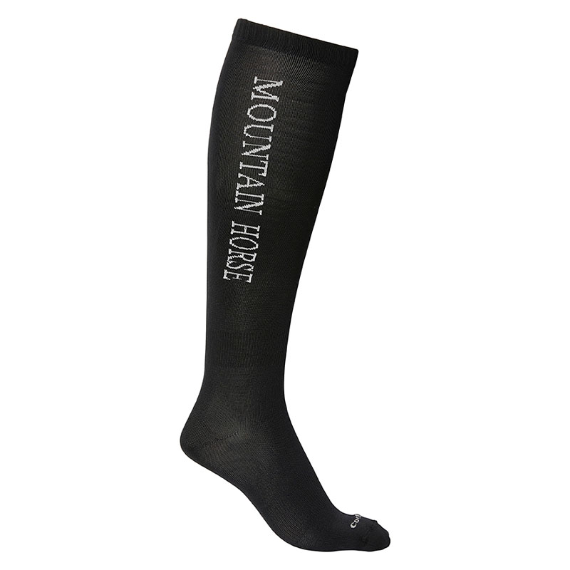 Svart, knehøy Coolmax-sokker, som er laget i hurtigtørkende garn som transporterer bort fukt. De er veldig lette og behagelige å ha på seg og inneholder bambusfiber, noe som hjelper til med å forhindre dårlig lukt. Ridestøvlene er prydet med Mountain Horse-logoen langs utsiden av leggen.