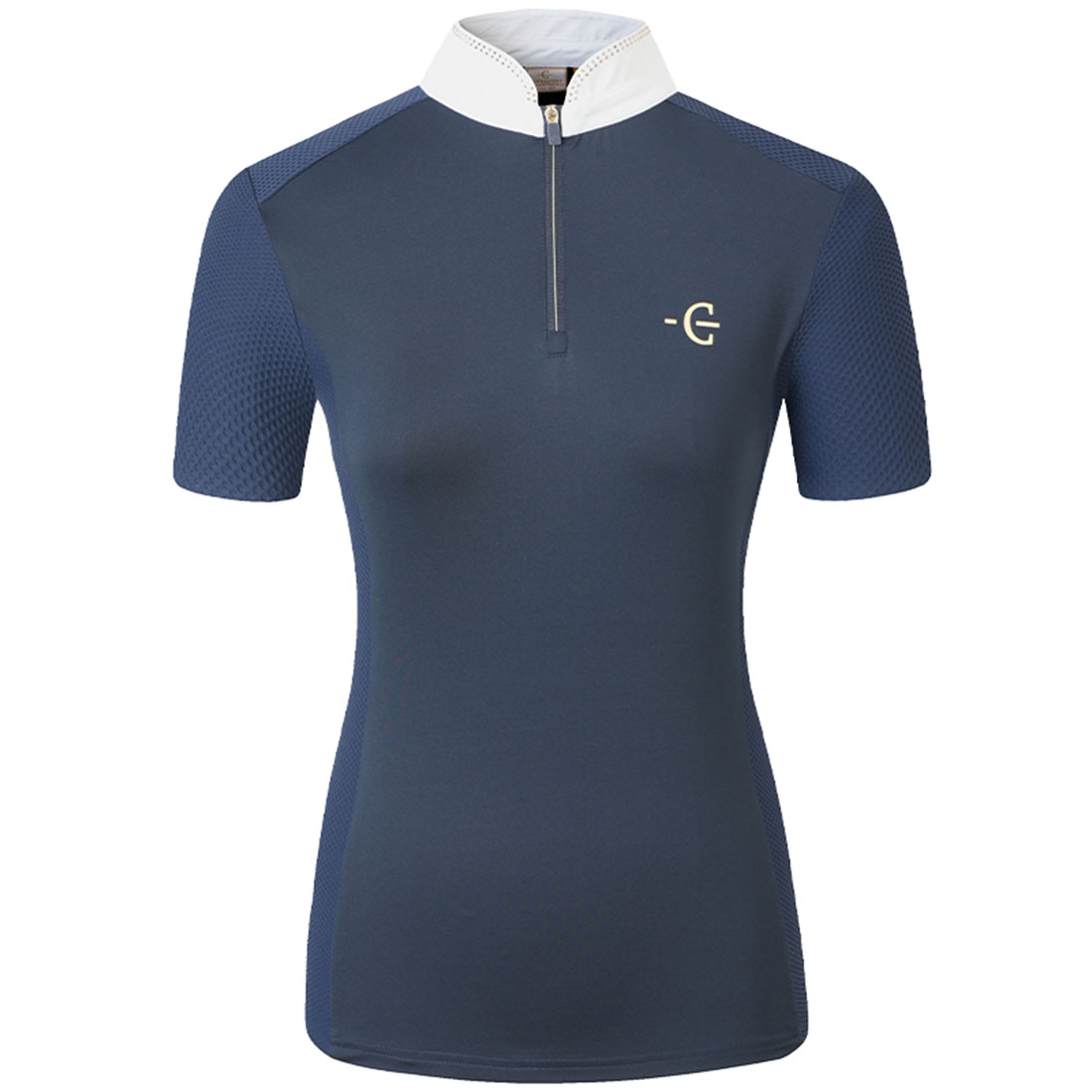 Covalliero stevneskjorte i marineblå kombinerer sportslig ytelse med stilig design. Det pustende, elastiske materialet sikrer optimal komfort og maksimal bevegelsesfrihet i salen. Den elegante høye kragen med diskret glitterdetalj gir en elegant touch.