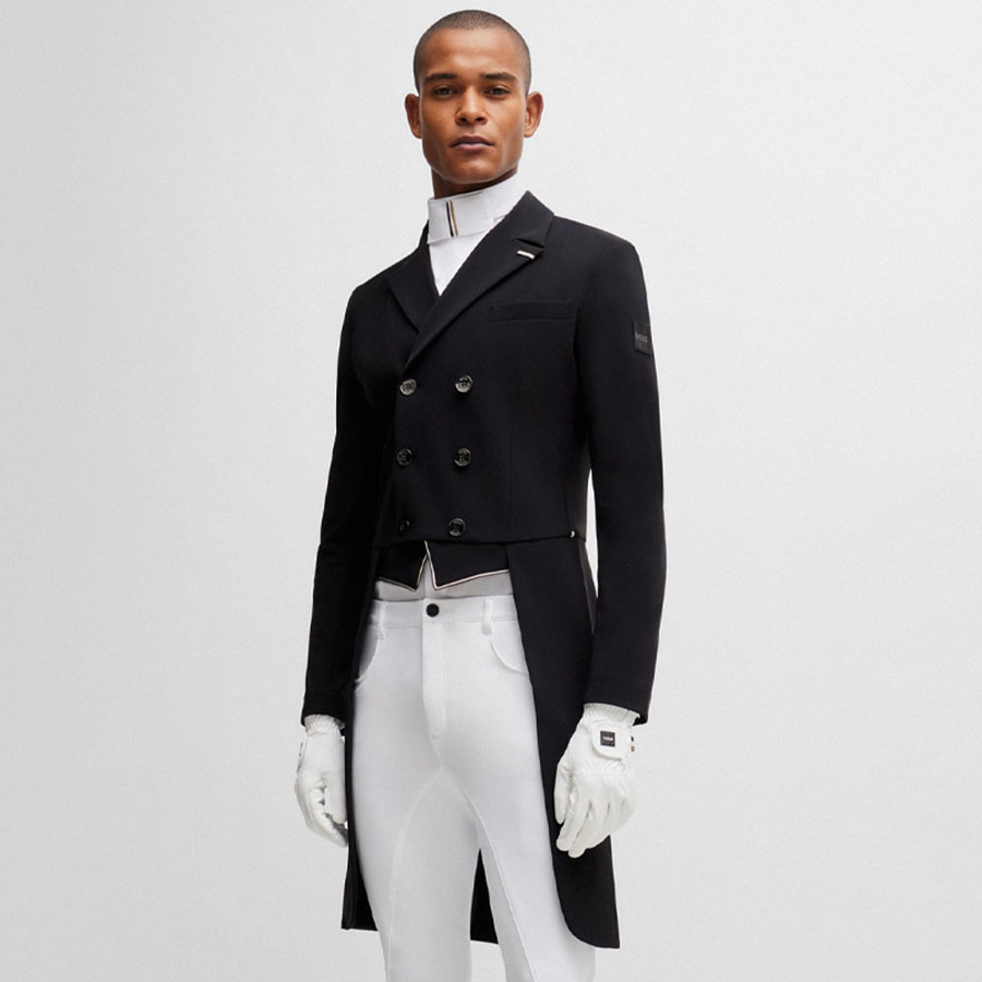 Frakken Mike fra BOSS Equestrian er en elegant og funksjonell frakk for herrer, perfekt for konkurranser og show. Den svarte fargen gir et klassisk utseende, mens den optimale passformen og høy bevegelsesfrihet sikrer komfort gjennom hele rideturen. Designet med BOSS-logoknapper i gunmetal, gir den en solbeskyttelsesfaktor på 50, noe som gjør den ideell for utendørs bruk.