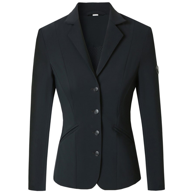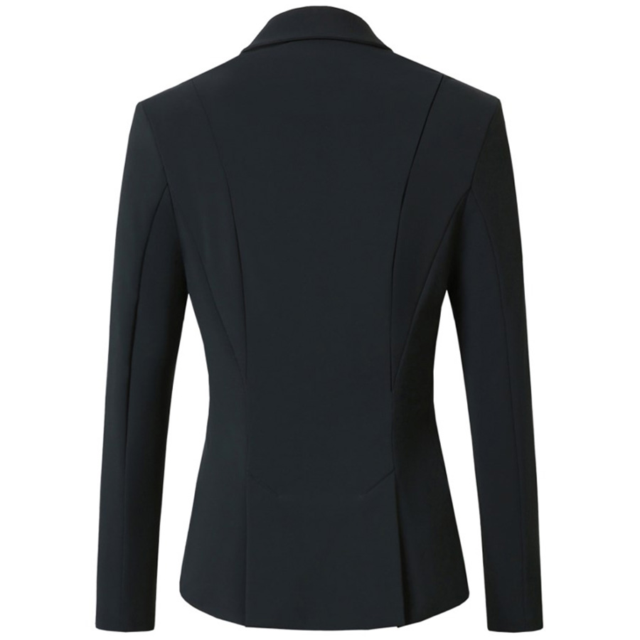 Covalliero Parigo konkurransejakke for damer er designet for å gi en perfekt passform og komfort under konkurranser. Den elastiske og pustende stoffkvaliteten sikrer at du kan bevege deg fritt, enten du rir eller står stille. Jakken har en stilren 4-knappsknapping med en skjult glidelås, noe som gir et elegant utseende. To dekorative lommer gir ekstra stil uten å gå på bekostning av funksjonaliteten. I tillegg har jakken to ventiler bak for økt ventilasjon, noe som er spesielt verdsatt på varme dager.