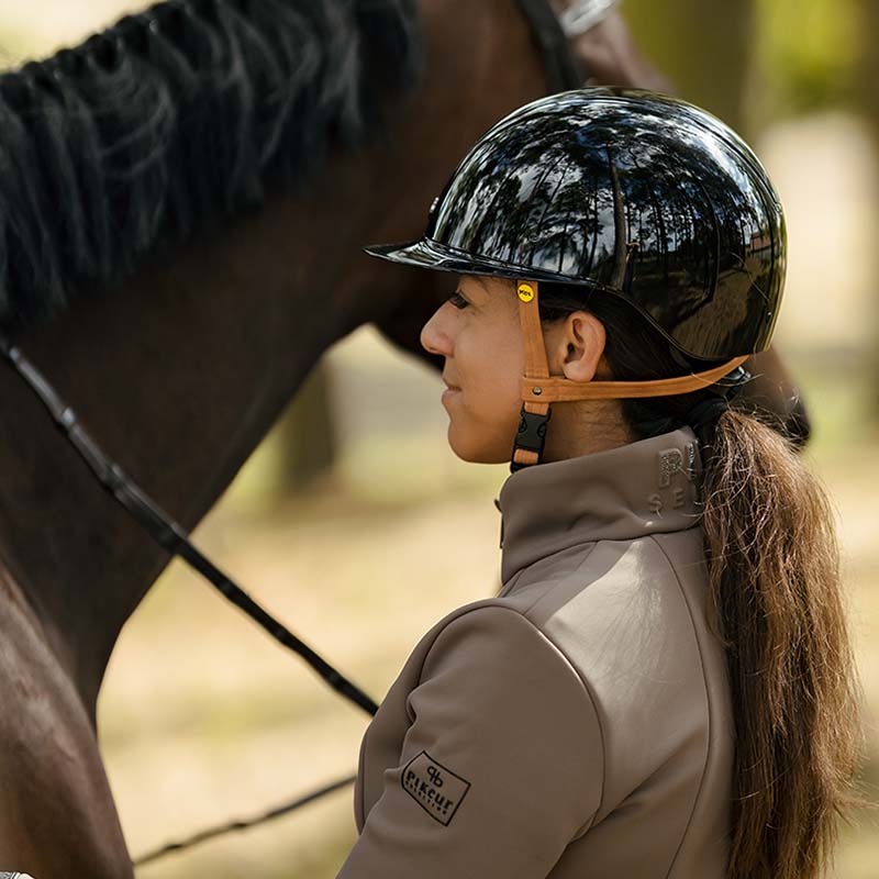 Hansbo Sports MIPS Vision Shiny Gem er en elegant og sikker ridehjelm. Den har en blank finish med bred skjerm og et skinnende panel omgitt av diskret glitter. Hjelmen er utstyrt med MIPS-systemet for ekstra beskyttelse og har seks ventilasjonsåpninger for optimal luftsirkulasjon. Den justerbare hakestroppen i brunt kunstskinn gir en komfortabel passform, og Cooldry-innredningen holder hodet kjølig og tørt.