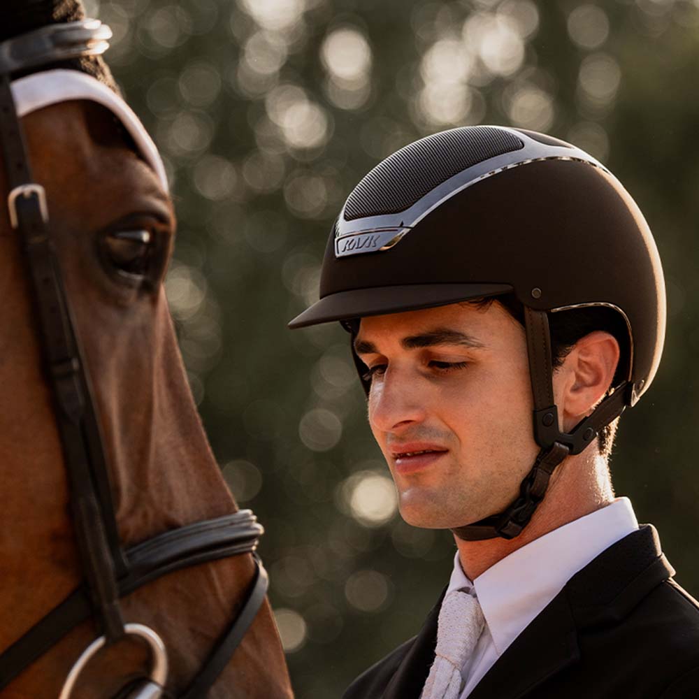 KASK Dogma Chrome, her i fargen Espresso Brown, er en høykvalitets ridehjelm med standardskjerm som kombinerer sikkerhet, komfort og et elegant, moderne design. Den matte overflaten brytes av med diskrete kromdetaljer ton-i-ton med skallet, noe som gir et stilrent uttrykk.