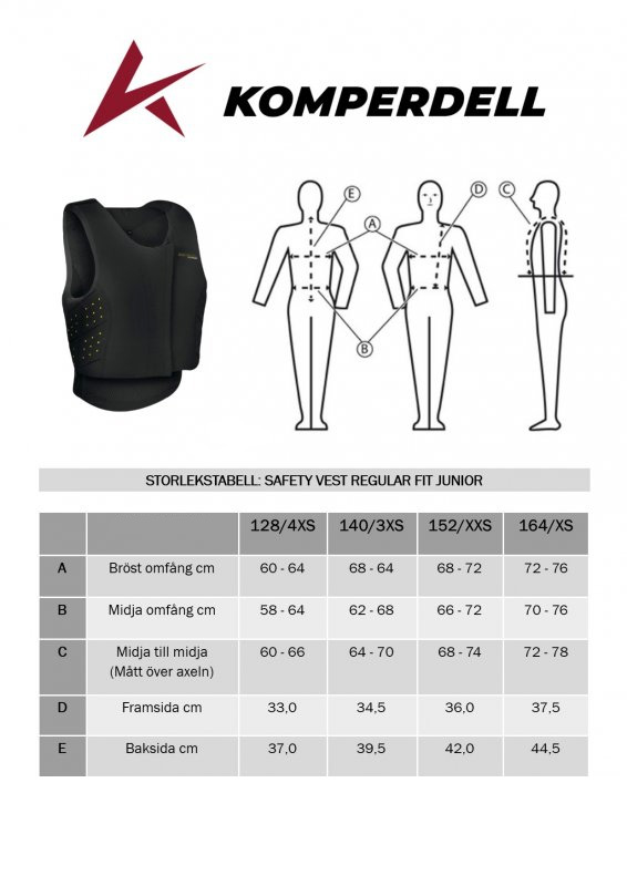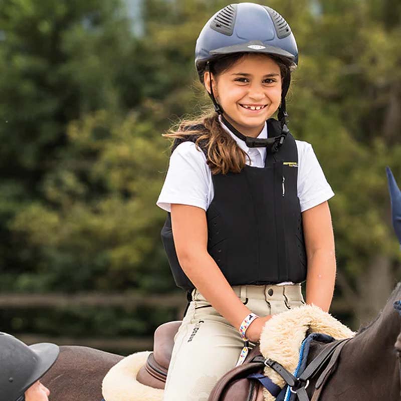 Sikkerhetsvesten for barn og juniorer er designet for å gi både komfort og maksimal beskyttelse under ridning. Med en Regular Fit passer den godt til ulike kroppstyper og justerer seg automatisk i midjen når glidelåsen lukkes, takket være lamellene på siden. Den oppfyller sikkerhetsstandarden EN 13158:20029 - nivå 3 og tilbyr 360 graders beskyttelse.