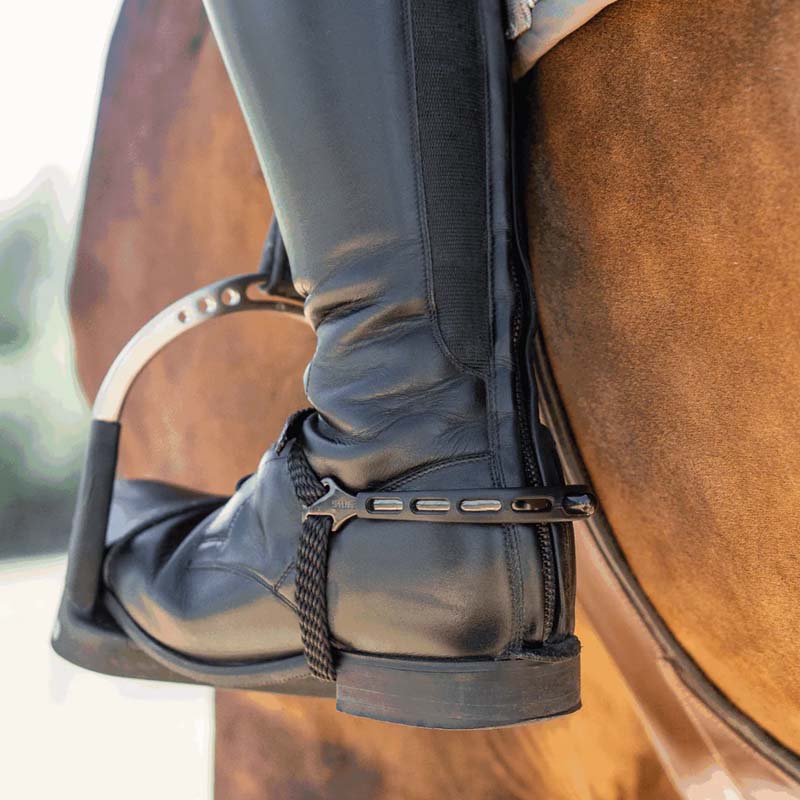 Ultra Fit Extra Grip-sporene med en kort, avrundet hals på 15 mm er utformet for å gi en noe mykere og kontrollert påvirkning. Modellen er laget av høykvalitets, mørkegrått, bruddsikkert rustfritt stål og inngår i Sprengers Ultra Fit Extra Grip-serie, der hver modell er utstyrt med et slitesterkt gummibelegg som gir forbedret grep mot støvelen og samtidig beskytter læret mot slitasje.