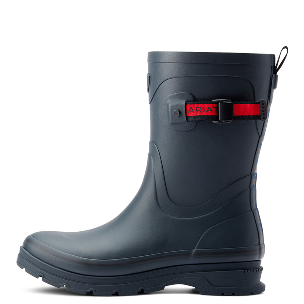 Ariats marinblå Kelmarsh Mid er et par slitesterke, smart designede gummistøvler av lavere modell. Ideelle å raskt dra på for å kunne ta deg ut på morgenstur med hunden eller for å fôre hestene i stallen.