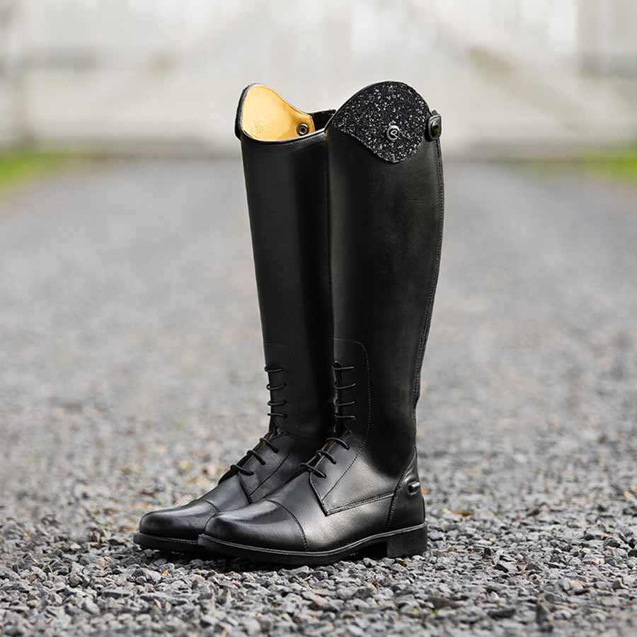 Ridestøvlene Romy for barn er både stilige og funksjonelle. Med en justerbar øvre del kan du enkelt feste forskjellige design på støvlene, som gjør dem unike for hver rideøkt. Støvlene har en glitrende design og kommer med en glidelås med elastisk innlegg bak og elastiske snorer foran for en behagelig passform. Disse støvlene er perfekte for unge ryttere som ønsker både stil og komfort under ridningen.