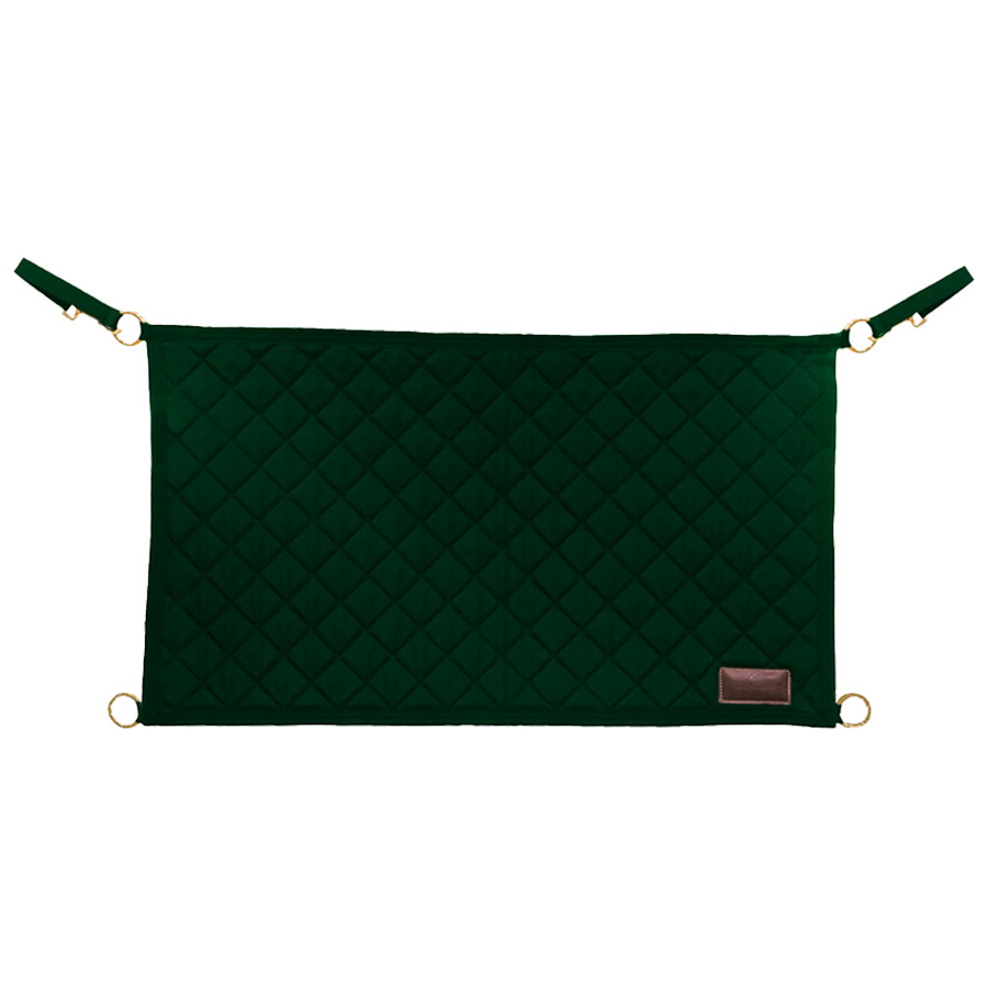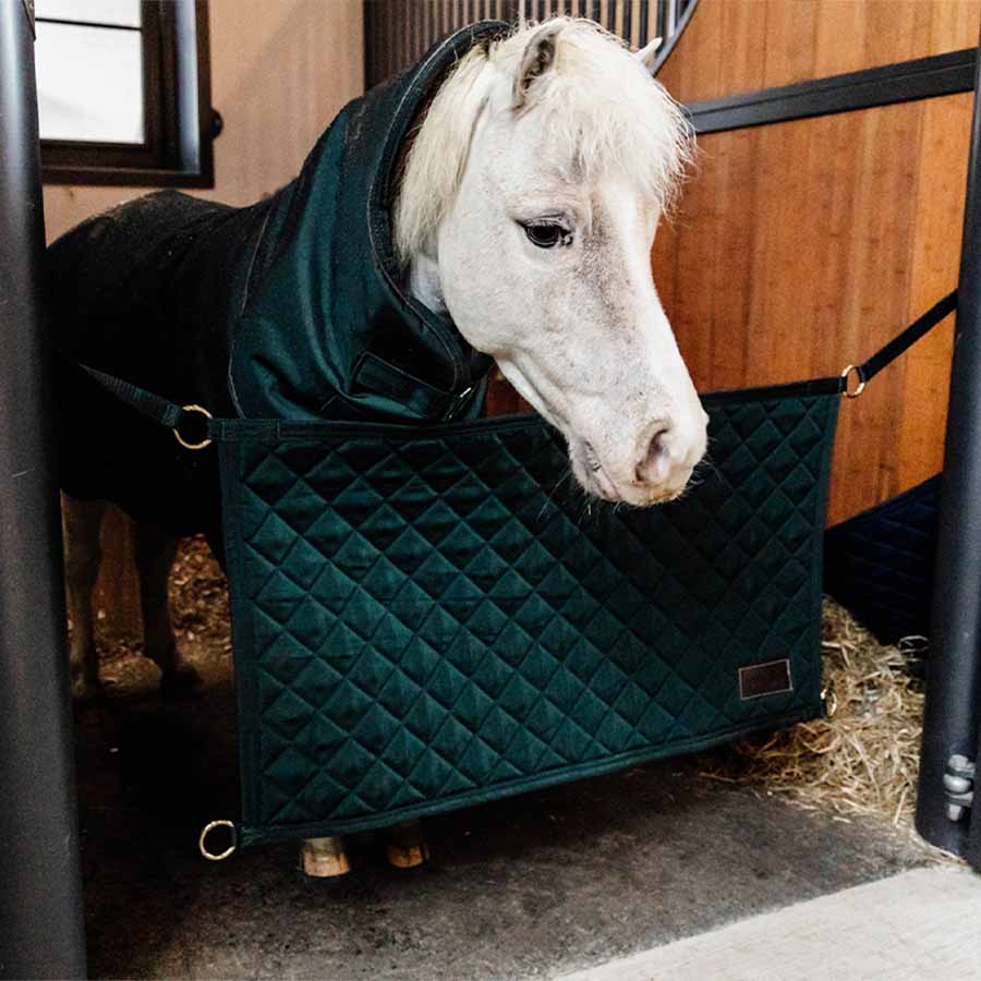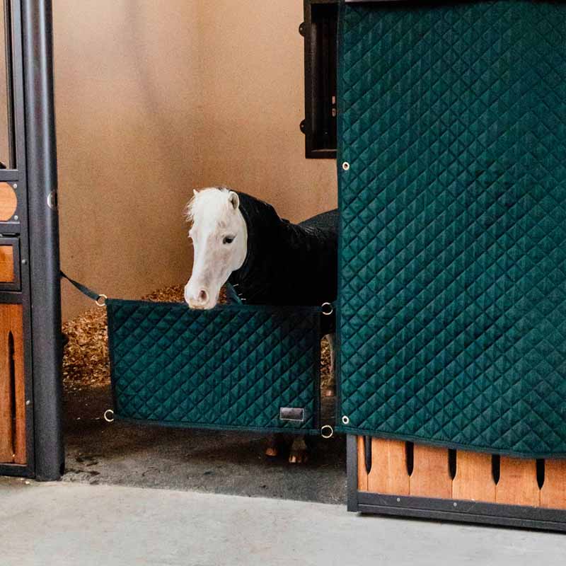 Stabilt boks-stopp fra Kentucky, designet med eksklusivt, quiltet utseende samt utstyrt med to forsterkede, gullfargede opphengingsringer i hjørnene. Boks-stoppet gjør det mulig for hesten å se ut og enklere kunne slappe av i boksen. Det mørkegrønne boks-stoppet, som fordelaktig kan matches med boks-gardinen i samme utførelse, er laget av slitesterkt 600 Denier polyester for en så lang levetid som mulig.