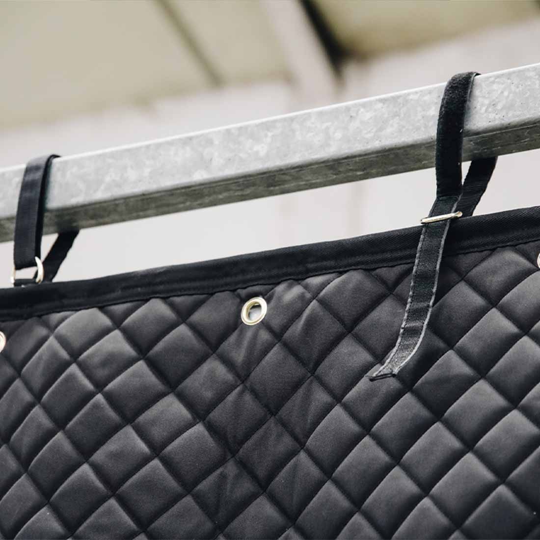 Kentuckys svarte, høykvalitets boks gardin Waterproof øker hestens velvære ved å tilby velfortjent ro og fred i boksen. Boks gardinen, som er utstyrt med 5 skjulte karabinkroker for å henge opp utstyr og tilbehør med, henges enkelt opp på boksveggen med hjelp av 5 integrerte, forsterkede opphengingsringer. Det luksuriøst quiltede mønsteret gir dessuten, sammen med de diskrete detaljene i fusk lær, en virkelig eksklusiv følelse.