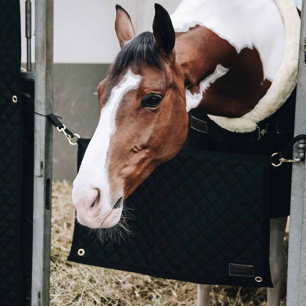 Stabilt boksstopp fra Kentucky med luksuriøst utseende og to forsterkede gullfargede ringer i hjørnene for å feste beskyttelsen. Perfekt matchende til boksgardinen i samme stil fra Kentucky. Boksstoppet gjør det mulig for hesten å titte ut og lettere å slappe av i boksen. Kentucky-logotypen i lærdetalj er av kunstlær og 100% dyrevennlig. Boksstoppet er laget av slitesterkt 600 Denier polyester for en lang levetid. En annen stor fordel med dette beskyttelsen er at det kan vaskes i maskin på 30 grader.