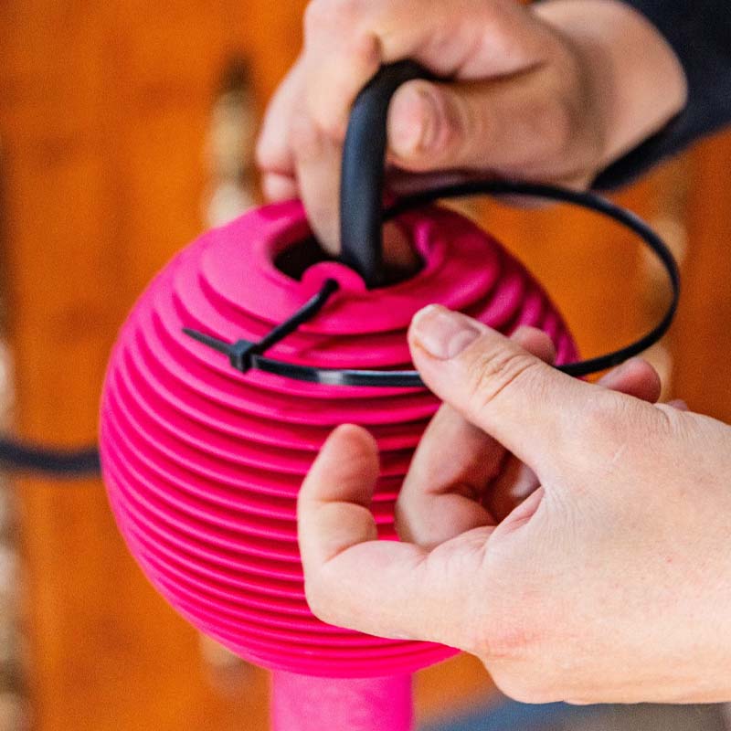 Beskyttelsesballen tres enkelt på oppbindingstauet og reduserer risikoen for at hesten vikler seg inn i eller skader seg på tau og spenner, samtidig som den hindrer at metall slår mot vegger og andre flater.