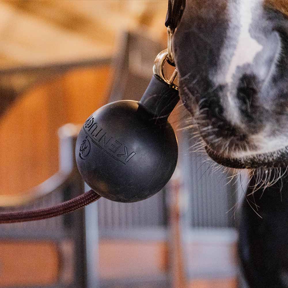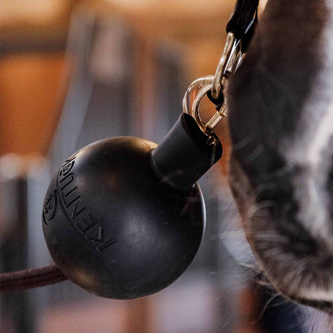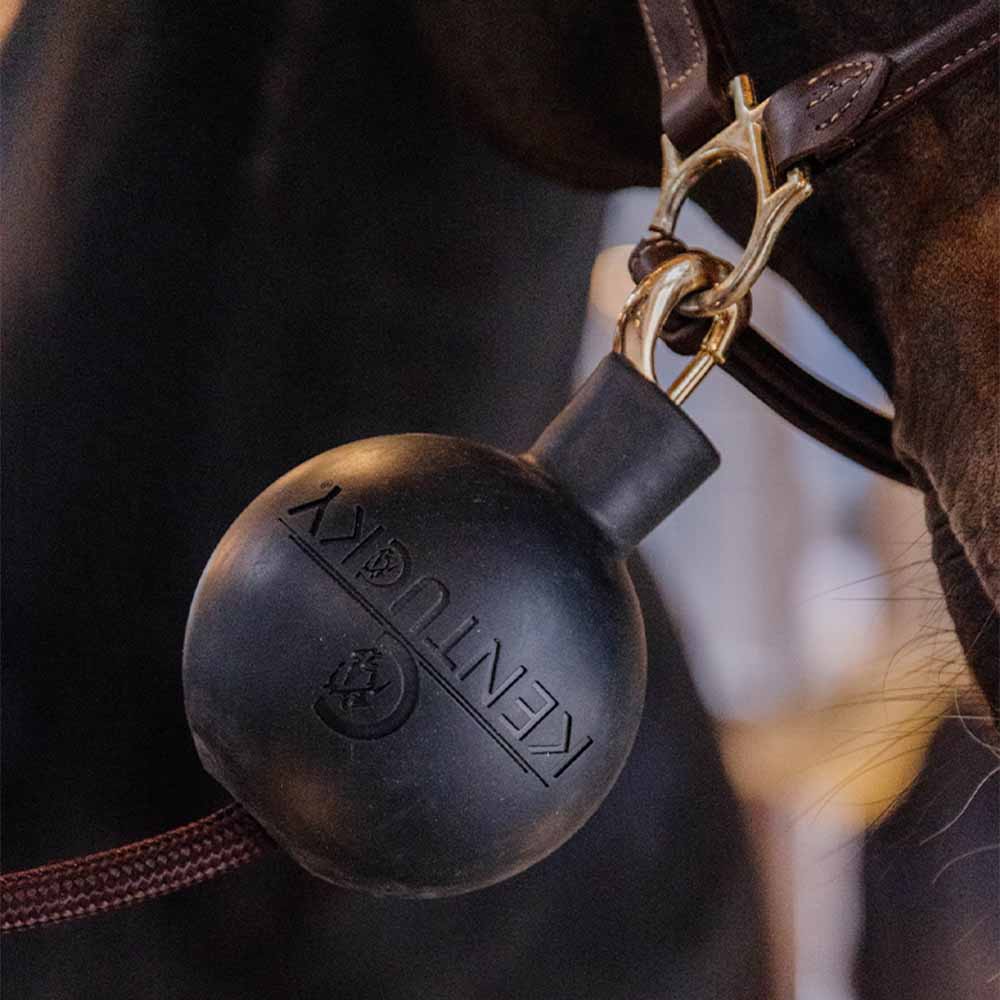 Lei av metallklirr, spenner som slår mot veggen eller hester som tygger på oppbindingstau? Denne gummiballen fra Kentucky er en smart og praktisk løsning som reduserer støy og øker sikkerheten i stallen. Ved å minimere eksponerte metalldeler reduseres også risikoen for at både hest og menneske setter seg fast eller skader seg.