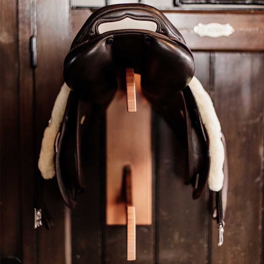 Elegant sadelhenger med plass for to sadler, laget i bambus som gjør den ekstra slitesterk og lett å rengjøre. Den er veldig enkel å henge hvor som helst takket være den store kroken på baksiden og lar seg derfor like godt bruke i stallgangen eller i sadelrommet, som på konkurranseboksen. Artikkelnr: