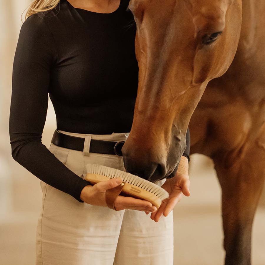 Overall Brush Body Shine skiller seg ut med sin bruk av ekte hestehår, som er kjent for sin overlegne evne til å polere og gi glans til hestens pels. I motsetning til syntetiske børster, tiltrekker og løfter hestehår naturlig opp smuss, noe som fremmer en sunnere og glansigere pels.