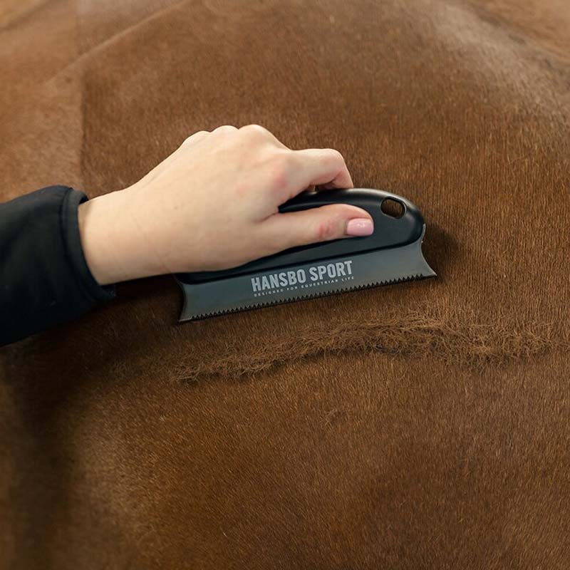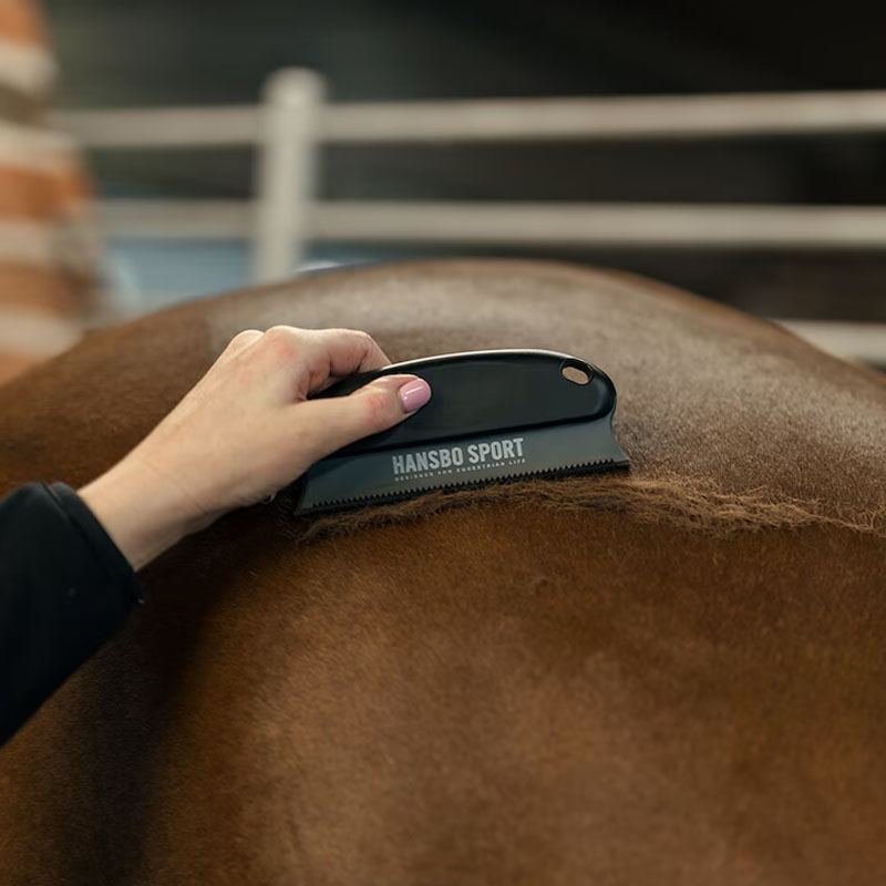 Hansbo Sport HS Svettekniv i Svart/Grå er et allsidig verktøy for alle dyreeiere. Den er perfekt for å fjerne hår fra hester, hunder og stallkatter, spesielt under røyteperioder. Det ergonomiske håndtaket og den myke, kamlignende gummidelen gjør det enkelt å effektivt fjerne overflødig hår. I tillegg kan den brukes på sjabraker og teddyskydd. Enkel å rengjøre etter bruk.