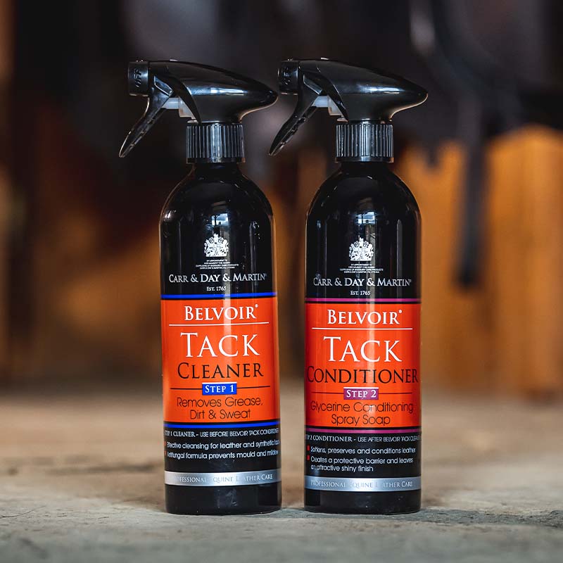 Belvoir Tack Cleaner Step 1 er første delen av fra Carr & Day & Martins lærvårdsduo og er et produkt som rengjør læret ved å løse opp inngrodd fett, svette og smuss som deretter enkelt tørkes av med en ren svamp eller klut. Den pH-neutrale sammensetningen verken tørker ut læret eller muggler på sømmene, de rengjørende ingrediensene i sprayen tar dessuten bort alle former for mugg fra læret og gir en ren overflate klar for påføring av mykgjørende såpe eller olje.For beste resultat, avslutt smøringen med den andre delen fra duon - Lærbalsam Belvoir Spray Step 2.