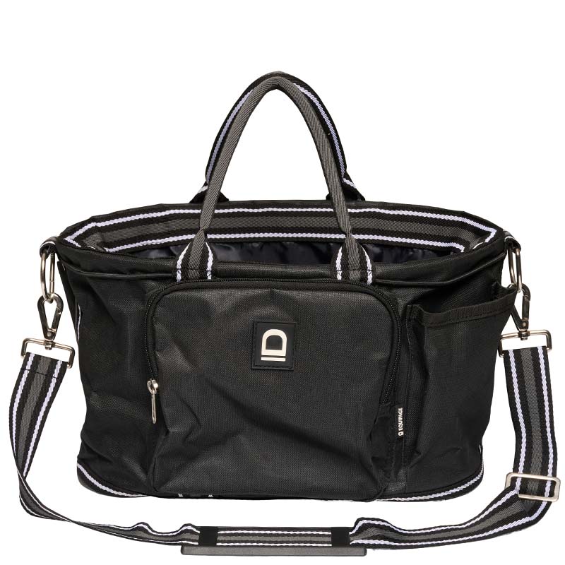 Smidig børsteveske, i svart, med både bærehåndtak og justerbar skulderrem. Lokken med snøring forhindrer at børster faller ut samtidig som alle småting lett kan organiseres i vesken ytterlomme eller i den innvendige glidelåslommen.